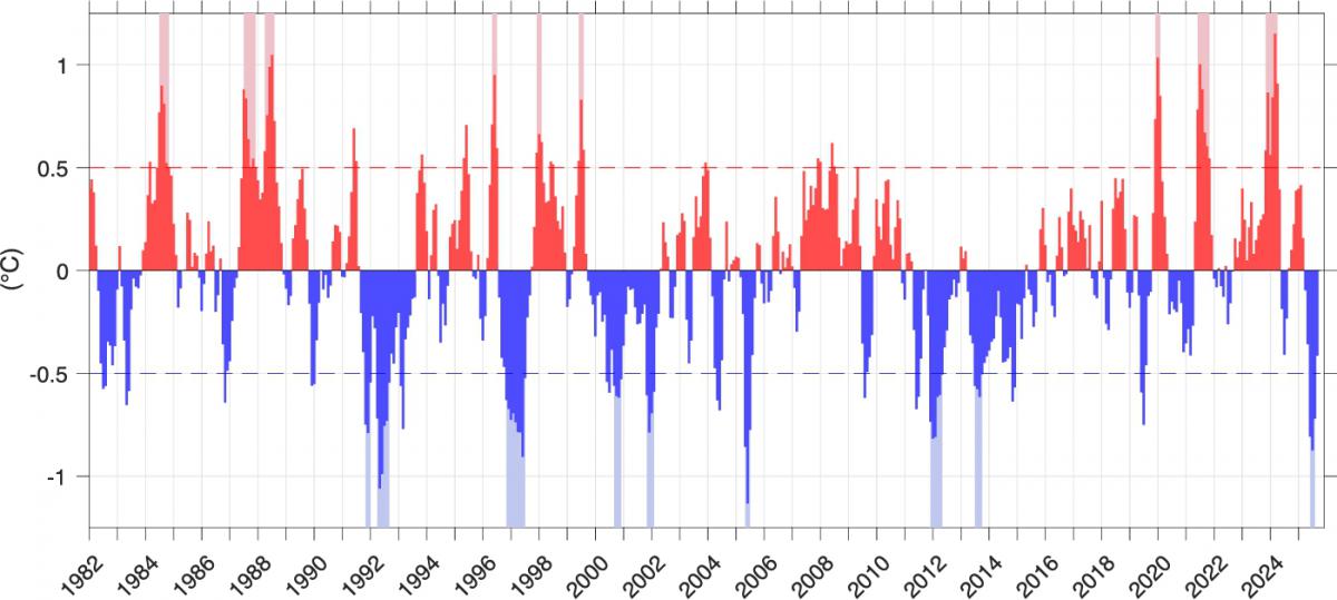 Figure 2: Monthly sea surface temperature anomalies in the eastern equatorial Atlantic (20°W-0°, 3°S-3°N; ATL3 region) from January 1982 to September 2025 from satellite observations. Blue bars indicate cold anomalies, red bars warm anomalies. Each value represents a mean of 3 consecutive months. Only if three consecutive mean values exceed the +- 0.5°C threshold (red and blue dashed lines) it is called warm or cold event. Such warm and cold events are marked by red and blue shadings, respectively. The long-term warming trend of 0.75°C between 1982 to 2025 has been removed from the time series.