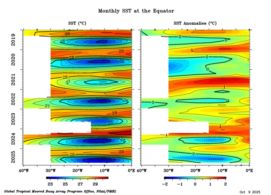 Figure 1: Sea surface temperature (left panel) and sea surface temperature anomalies (right panel) along the equator from January 2019 (top) to September 2025 (bottom), based on measurements from temperature sensors on moored PIRATA buoys at 35°W, 23°W, 10°W, 3°W, and 0°. Under typical conditions, the equatorial Atlantic warms during boreal spring and cools during summer. However, the strength of this seasonal cycle varies from year to year (left panel). Periods with unusually strong departures from the normal cycle (right panel) appear as warm events (2019, 2021, 2024) or cold events (2024, 2025), with the most extreme of these developing into Atlantic Niños or Atlantic Niñas, respectively.
