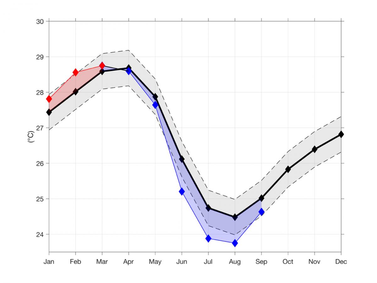 Figure 3: Sea surface temperature in the eastern equatorial Atlantic (20°W-0°, 3°S-3°N). The black line and dots show the typical evolution of SST. The dashed line and the grey shading indicate ±0.5°C from the normal situation. The colored line and dots show SST in 2025 so far. Red colors indicate temperatures above normal, blue colors indicate temperatures below normal. June, July, and August were more than 0.5°C colder than normal.