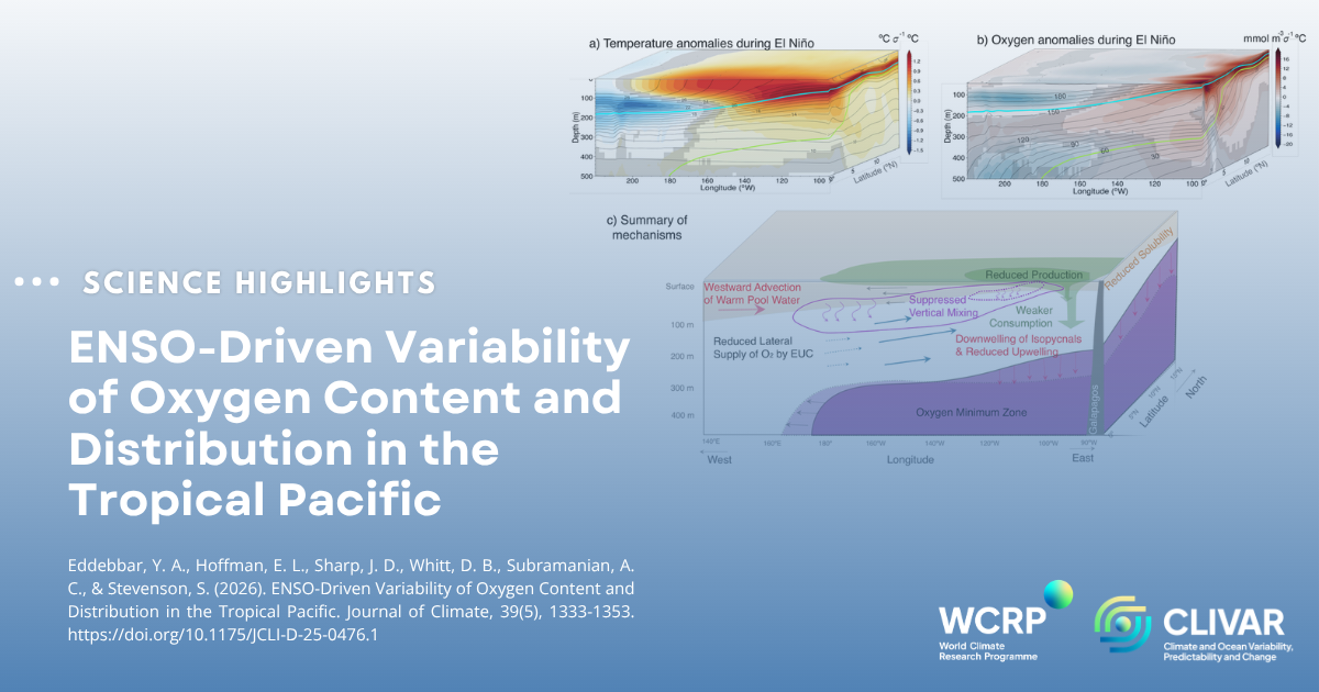 Eddebbar, Y. A., Hoffman, E. L., Sharp, J. D., Whitt, D. B., Subramanian, A. C., & Stevenson, S. (2026). ENSO-Driven Variability of Oxygen Content and Distribution in the Tropical Pacific. Journal of Climate, 39(5), 1333-1353. https://doi.org/10.1175/JCLI-D-25-0476.1